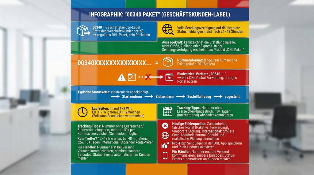 Außerdem existieren im Forwarding-/Speditionsbereich (DHL Global Forwarding) Formate, in denen das Präfix 00340 im Kontext von Carrier-/Masterbill-Nummern genutzt wird – häufig mit Bindestrich, zum Beispiel 00340-12345678. Das ist kein klassisches DHL-Paketformat für Endkunden, sondern eine Referenz in Frachtketten (Luft/See). Wenn Du so eine Darstellung siehst, prüfe, ob Du die richtige Tracking-Plattform verwendest (DHL Paket vs. DHL Forwarding).