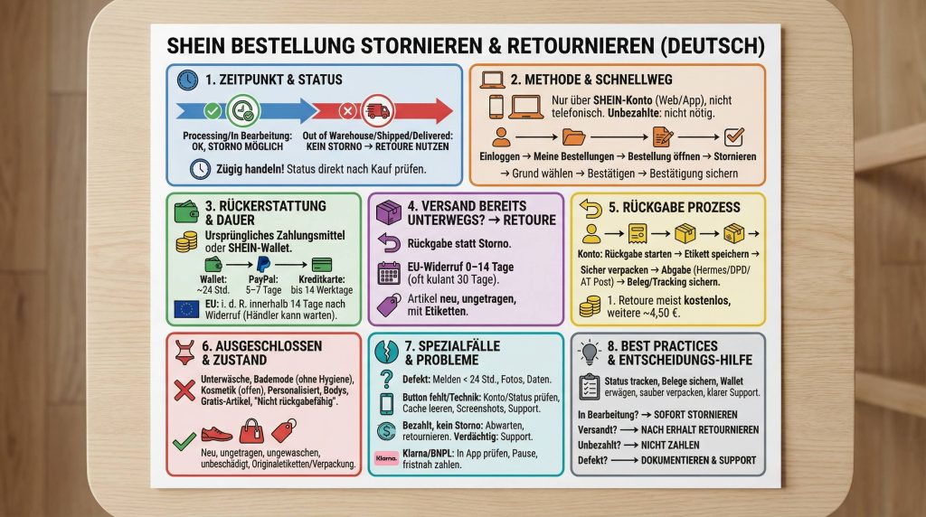 Du willst eine SHEIN-Bestellung stornieren – am besten jetzt sofort und ohne Reibungsverluste? Dann findest du hier die präzisen Schritte, klare Voraussetzungen, konkrete Zeitrahmen für Rückerstattungen sowie Lösungen für Sonderfälle (z. B. Klarna, bereits versandt, technische Probleme). Dieser Leitfaden erklärt dir sachlich und vollständig, wie du vorgehst – im Web, in der App und bei Rückgaben nach Versand. Außerdem erfährst du, welche Artikel nicht rückgabefähig sind, was es mit der SHEIN-Wallet auf sich hat und wie du den Kundenservice richtig involvierst.